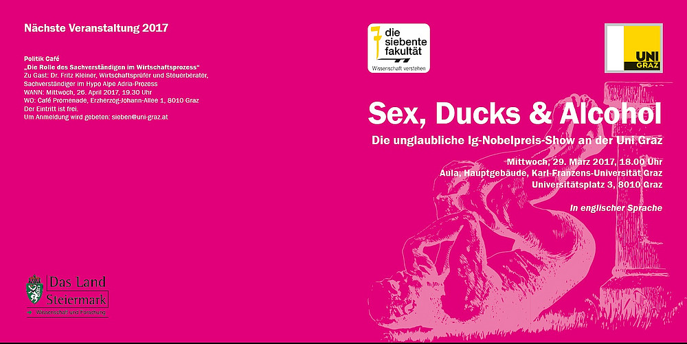 Die 7. fakultät der Uni Graz organisiert am 29. März erstmalig eine Veranstaltung, in der drei renommierte WissenschaftlerInnen auftreten, die in den vergangenen Jahren an der Universität Harvard mit dem Ig-Nobelpreis ausgezeichnet wurden. Die Vorträge bieten Studierenden die Möglichkeit erstklassige Forschung zu außergewöhnlichen Themen zu erleben und werden in englischer Sprache abgehalten.
